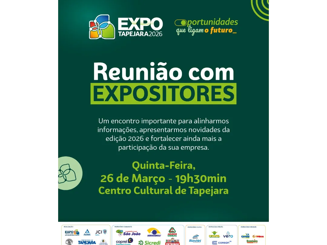 A organização da Expo Tapejara 2026 realiza, na próxima quinta-feira, dia 26 de março, uma reunião voltada aos expositores interessados em integrar a feira. O encontro acontece às 19h30, no Centro Cultural de Tapejara.