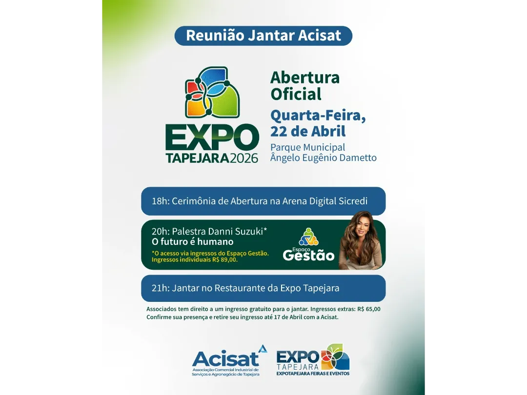 A Associação Comercial, Industrial, de Serviços e Agronegócios de Tapejara (Acisat) promove, no dia 22 de abril, mais uma edição da tradicional reunião jantar, desta vez em um momento especial: integrada à programação de abertura da Expo Tapejara 2026.