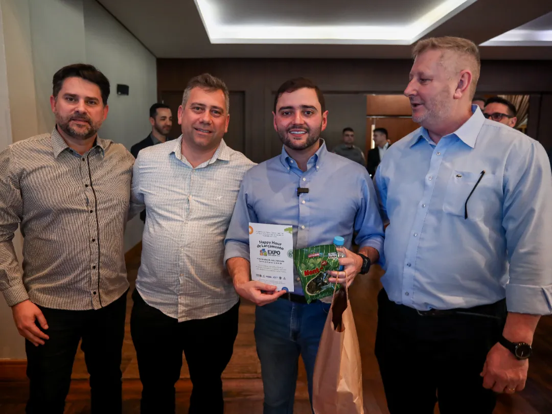 O presidente da Expo Tapejara, Daniel Graminha Vieira, o presidente da Acisat, Marcelo Zanchetta, e o secretário de Desenvolvimento Econômico, Inovação e Tecnologia, Claudiomiro Sossella, entregaram nesta quinta-feira (02) o convite oficial para o lançamento da feira ao vice-governador do Rio Grande